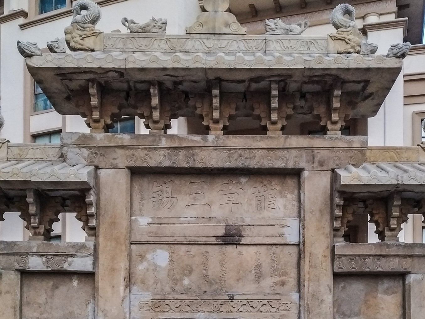 大棗園牌坊為一處兩座,間距為60米。形制及大小基本相同,皆為四柱三間,全石雕筑。頂部牌樓為斗拱承檐之仿木構型,精雕細刻,氣勢不凡。東牌坊坊額兩面均橫刻“龍章三錫”四個楷書大字,下一層橫額豎刻王柱今的履歷;西牌坊坊額兩面均橫刻“義方式訓”四個楷書大字,下一層橫額上豎刻王柱今的三個兒子和孫子王懿科舉應考的名次。大棗園牌坊,是目前青島地區唯一幸存的一處功德石牌坊。